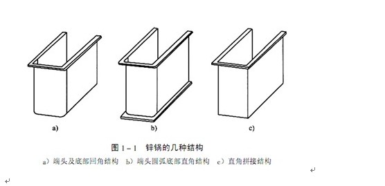 根据锌锅各立面之间以及立面与底面的连结方式,锌锅的结构通常可分为下列三种形式: